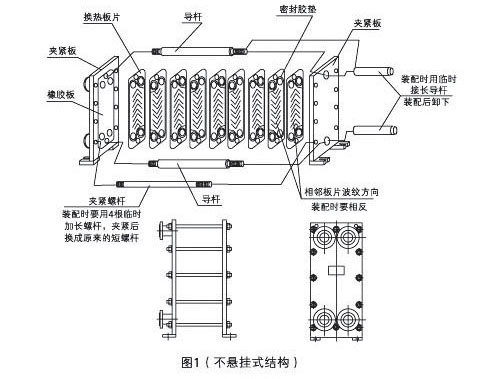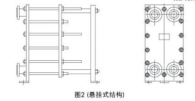 板式換熱器在裝配形式上又可分為不懸掛式(圖1)和懸掛式(圖2),不懸掛式換熱器不帶支柱,地腳板直接焊在二個(gè)夾緊板的下端,它適于重量較小的小型號(hào)的換熱器,以便在拆裝時(shí)能搬動(dòng)。懸掛式換熱器帶有支柱,它拆裝時(shí)可在有所原位不動(dòng),活動(dòng)夾緊板和換熱板片懸掛在上導(dǎo)桿上,可以移動(dòng),換熱板片可以拆下和裝上,較大型號(hào)的換熱器一般采用懸掛式的,以便于拆裝維修。