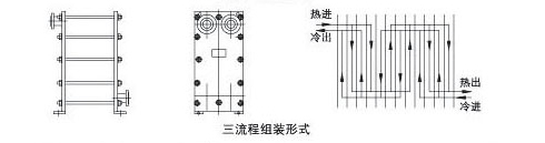 板式換熱器根據(jù)介質(zhì)的溫差和流量,可以裝配成單流程、雙流程、三流程以及多流程的形式,單流程是指介質(zhì)在換熱器內(nèi)流過一個(gè)流程,雙流程是指介質(zhì)在換熱器內(nèi)折返流過兩個(gè)過程,依次類推,各種流程的外形圖和其流程示意圖如圖三。單流程時(shí)接口可以都在前面的夾緊板上,也可以不都在前面的夾緊板上,當(dāng)采用多流程時(shí),換熱器的四個(gè)接口就不能在同一側(cè)的夾緊板上,進(jìn)出口要位于前后兩個(gè)夾緊板上。