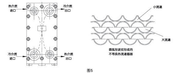 BRB 型的特點(diǎn)是,采用兩種不同的換熱板片和膠墊(俗稱 A 板 A 墊和 B 板 B 墊)。板片對(duì)角方位上是兩個(gè)大流道孔,另外對(duì)角方位是兩個(gè)小流道孔,同種介質(zhì)在對(duì)角流道孔進(jìn)出,不能在同側(cè)流道孔進(jìn)出,如圖5。板片波紋截面形狀為圓弧形,兩種板片的圓弧形狀方向相反,裝配時(shí)兩種板片交替疊放,裝配后,由于兩種板片波紋截面弧狀彼此相反,對(duì)應(yīng)大流道孔的板片波紋是圓弧里面相對(duì),內(nèi)腔形成較大的流道截面;而對(duì)應(yīng)小流道孔的板片波紋是圓弧的背面,內(nèi)腔形成小的流道截面,兩截面面積的比例大致為2:1,這就是 BRB 型不等流道截面的由來。