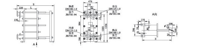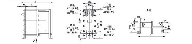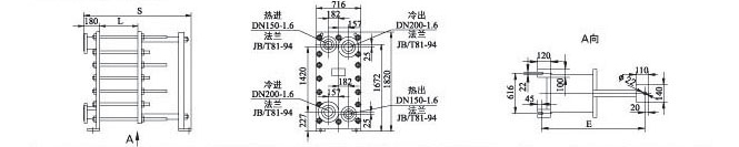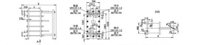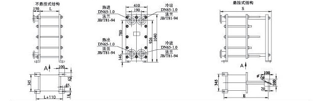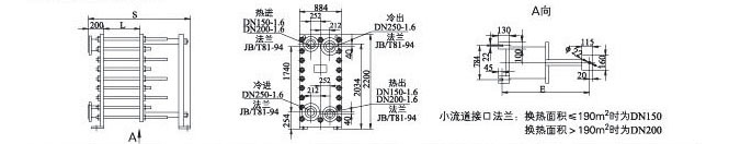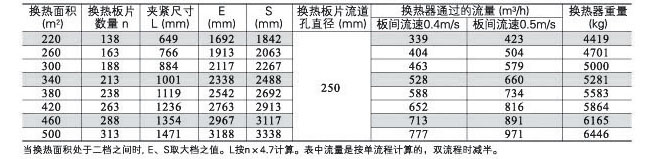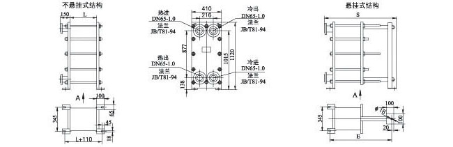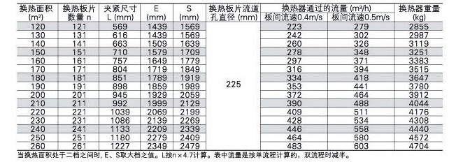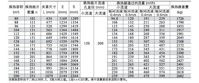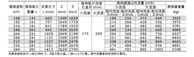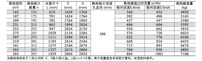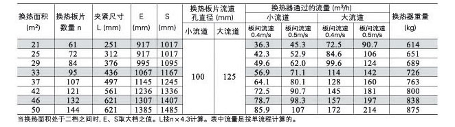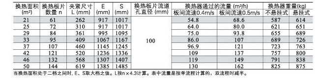 由于不同時(shí)期的產(chǎn)品參數(shù)可能有變化,因此下面參數(shù)表中的數(shù)據(jù)僅供參考。圖中接口法蘭大小為常規(guī)規(guī)格,如果流量較小時(shí)可以減少,但一般不能加大。表中都是以單流程組裝形式為例,也可裝成多流程形式。換熱面積也可以不按表中格擋數(shù)值而任意選取,當(dāng)換熱面積位于表中二檔之間時(shí),懸掛式的E、S尺寸要按下一檔的大檔之值確定,L尺寸要按表下面的算式算出。