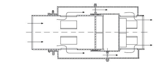 結(jié)構(gòu)特點(diǎn)是:外套串聯(lián)兩個(gè)密封體,內(nèi)套后端加擋板,流體經(jīng)內(nèi)套的孔道引到兩密封箱間隔腔,再經(jīng)外套間隔腔處孔道,引回到后部加擋板的主管道,這種補(bǔ)償器重量大、安裝尺寸長。