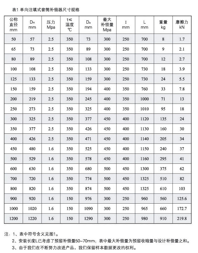 單向補(bǔ)償式補(bǔ)償器,產(chǎn)品規(guī)格見表1,表中符號(hào)含義見圖1。
