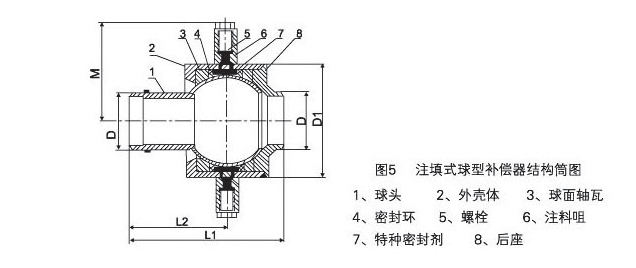 注填式球型補(bǔ)償器的結(jié)構(gòu)見圖5,它主要由球頭、外殼體、后座、球面軸瓦、密封環(huán)和注料咀等組成。